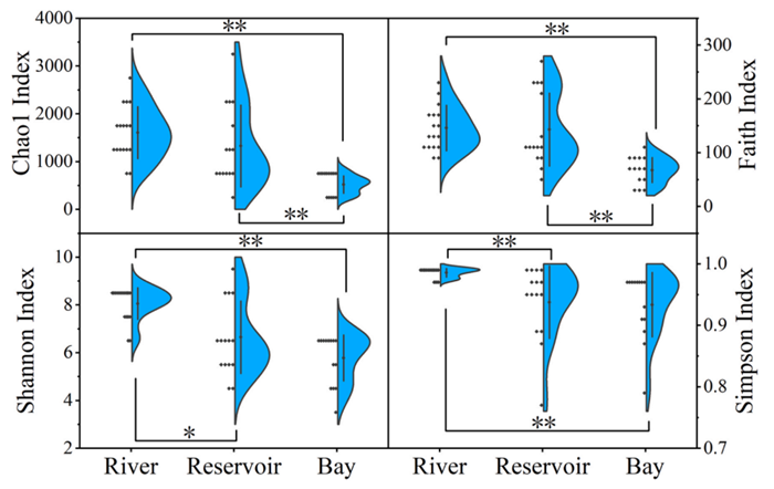 三类水环境的微生物群落组成和多样性也存在显著差异性。Proteobacteria、Cyanobacteria、Bacteroidota、Actinobacteriota、Firmicutes和Myxococcota是三类水环境中的主要优势菌门,分别占河流、水库和海湾水体菌群平均相对丰度的95.17%、95.81%和70.09%。但河流中优势菌属为Flavobacterium、Limnohabitans、Undibacterium和Rheinheimera,水库中的优势属为Microcystis_PCC_9714、Flavobacterium、Undibacterium和Rheinheimera,而海湾中则以Vibrio, Synechococcus_CC9902、Photobacterium和Woeseia更占优势(图2)。东江菌群α多样性指数(Shannon和Simpson指数)显著高于水库和海湾,河流微生物物种丰富度更高(图3)。