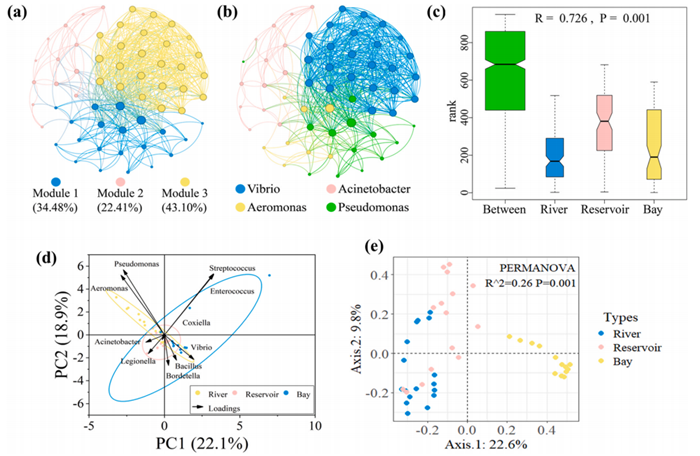 生态风险评估显示,三类水环境风险水平存在显著差异。新丰江水库因含PVC、PEUR等更高毒性的MPs,聚合物危害指数(PHI)和潜在生态风险指数(PERI)显著高于东江与大亚湾(图5)。与河流和海湾相比,水库中MPs的生态风险更高。网络分析将潜在致病菌间的关系划分为三个模块,河流、水库和海湾分别对应优势菌Pseudomonas、Acinetobacter和Vibrio;ANOSIM分析显示组间差异显著大于组内差异(R=0.726,P=0.001);降维分析也显示三类水环境间的潜在致病菌各自聚集成簇(图6)。这些发现表明,不同流域潜在致病菌的差异突显了不同自然水环境之间潜在的风险差异。