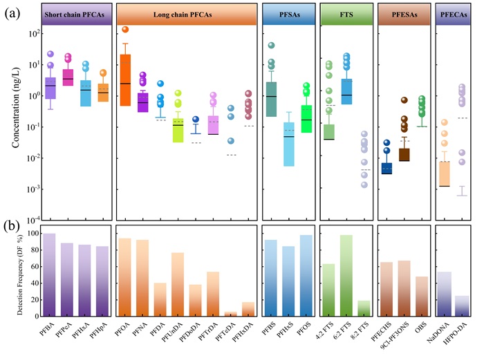 利用箱型图展示了该地区PFAS的浓度与检测频率。其中在所检测的PFAS中PFOA的最高,平均浓度为11.89 ± 21.49 ng/L。此外,在该地区PFOS的检出频率也达到了98.1%。PFOA和PFOS作为传统PFAS的典型代表,被《斯德哥尔摩公约》列为持久性有机污染物(POPs),应该更加引起重视。对于PFOA而言,本研究的PFOA平均浓度超过了美国环境保护署(USEPA)发布的 PFOA 最高污染物水平(MCL,4 ng/L)和健康咨询水平(0.004 ng/L)。此外,地下水样本中发现了众多新的 PFAS 替代物,这进一步复杂了污染状况,凸显了需要立即予以关注的必要性。