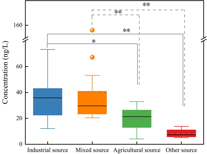 根据地下水采样点位半径500 m范围内的土地利用比例最高进行分类,我们将采样点分类为工业源、农业源、混合源以及没有工业和农业源的其他来源。将所有PFAS按四种来源进行分类,并对统计数据进行显著性检验。结果表明在珠三角地区,在复杂的混合污染源中应更加注重工业制造可能会给地下水PFAS污染带来较高的风险。