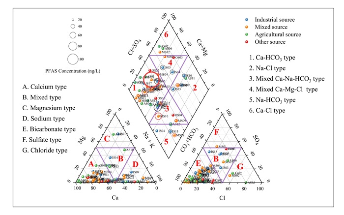 Piper三线图显示了地下水样品的水文地球化学特性,在一定程度上可以反映人为活动对地下水化学演变驱动,可以反映地下水污染的潜在来源。通过Gibbs图进一步确定地下水主要离子的控制类型为岩石风化和大气降雨控制型。水化学类型为Ca-HCO3的地下水样本通常含有相对较高的PFAS浓度。
