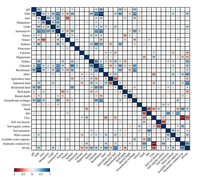 图4 PFAS与地下水的水文化学地质特征之间的Spearman相关性