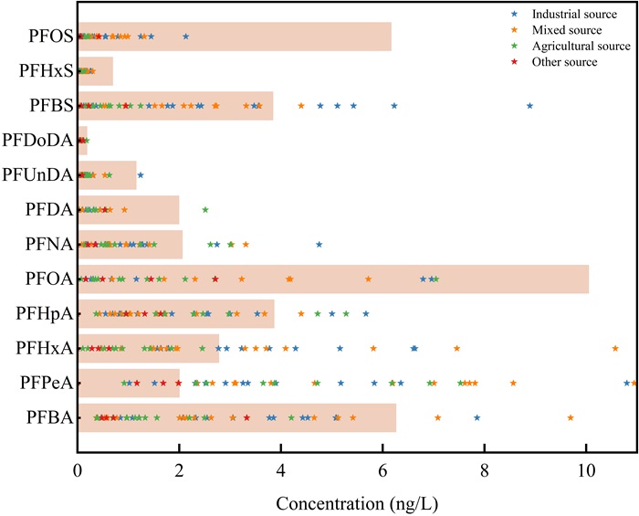 图5 中国28个城市降水中PFAS平均浓度的对比(浅红色条)与本研究中所测的PFAS浓度的对比(星标)