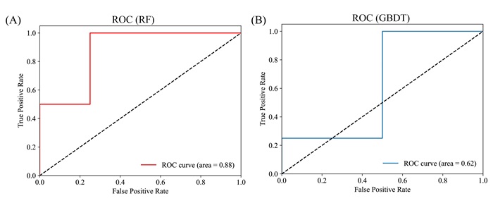图8 用于测试(A) RF和(B) GBDT分类模型的ROC曲线