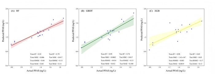基于RF、GBDT和XGB算法构建回归模型,利用52个点位的水文地质条件、地球化学和土地利用指标预测PFAS浓度。RF和GBDTT模型的拟合度优于XGB。XGB训练R2为0.94,测试R2仅为0.78,出现了过拟合现象。这可能与XGB作为一种高效的迭代增强算法,后续的树依赖于前面树的结果,逐步提升模型的性能,会对训练数据中的异常值较为敏感,捕捉数据中的复杂模式,从而对较少的测试数据集的识别效果较差,产生过拟合现象。