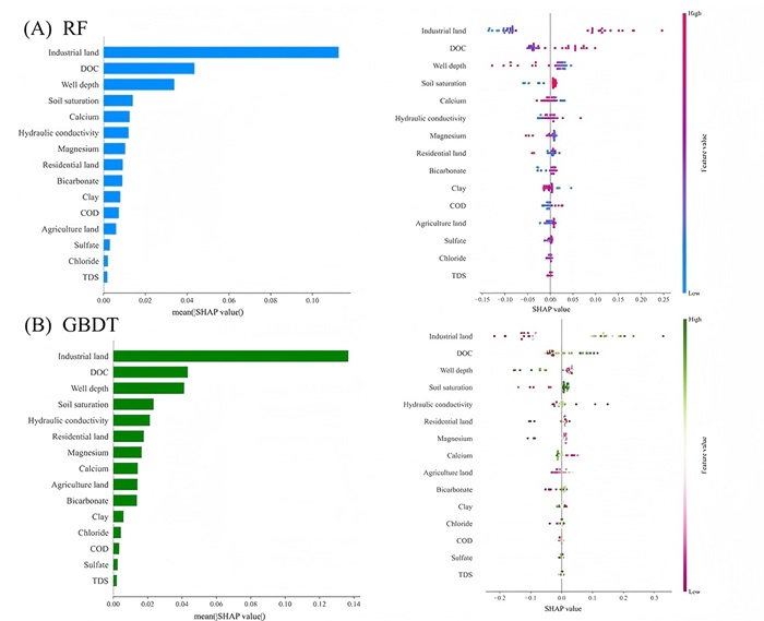 有必要了解所构建模型预测输出的原因,并为模型输出的解释提供理论验证,我们选择SHAP作为特征重要性选择方法。研究结果表明,采样井附近的工业土地面积对PFAS预测起着正向作用,随着采样井附近工业土地面积的增加,PFAS浓度增加。井深对PFAS浓度的预测起着负向作用,PFAS浓度高的往往出现在较浅的地下水井。在点位土壤饱和度较低时,SHAP 值通常是负的,这表明在较低的水饱和度下,将会增强PFAS在土壤中的空气-水界面上的吸附性,导致进入地下水PFAS的浓度降低。具有高水力传导率的土壤往往是大孔隙比例、土壤粒径较粗以及孔隙联通性好的砂土及砾质土占主导的土壤,它们对PFAS的吸附较弱,导致PFAS更容易进入地下水。