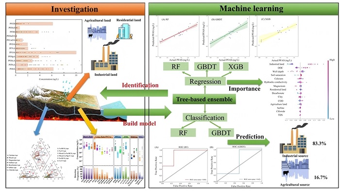 全氟和多氟烷基物质(PFAS)在地下水中的污染问题日益严重,传统调查方法成本高、周期长。机器学习为PFAS污染预测与溯源提供了有效工具,有助于优先调查和科学防控。本研究结合机器学习在PFAS污染预测与溯源中的优势,采用随机森林(RF)、梯度提升决策树(GBDT)和极限梯度提升(XGB)模型,系统评估并预测珠三角地区地下水PFAS的分布特征与污染来源。研究发现,地下水化学特征与空间地理信息可有效预测PFAS污染,工业用地、DOC、井深和土壤饱和度是关键因子。通过PFAS组成特征可识别工业与农业混合污染中各源的贡献率,工业源贡献高达83.3%,农业源仅为16.7%。本研究为区域地下水PFAS污染快速评估与精准治理提供了可靠技术方法与数据支持。